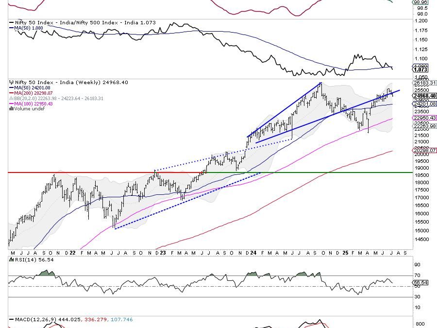 From a pattern analysis perspective, Nifty is trading just below the upper bound of a rising channel that it had briefly broken out of. With the Index slipping below the support levels of 25000-25150, it faces resistance at this zone again, failing to follow through on the breakout. Price action is still above the 20-week and 50-week moving averages, maintaining a bullish undertone from a medium-term perspective. However, the ongoing sideways action indicates a lack of fresh directional conviction.