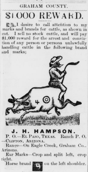 Another ad in a June 17, 1886 edition of Hoof and Horn, a Prescott, Arizona newspaper largely devoted to livestock news, posted a standing bounty for cattle rustlers: