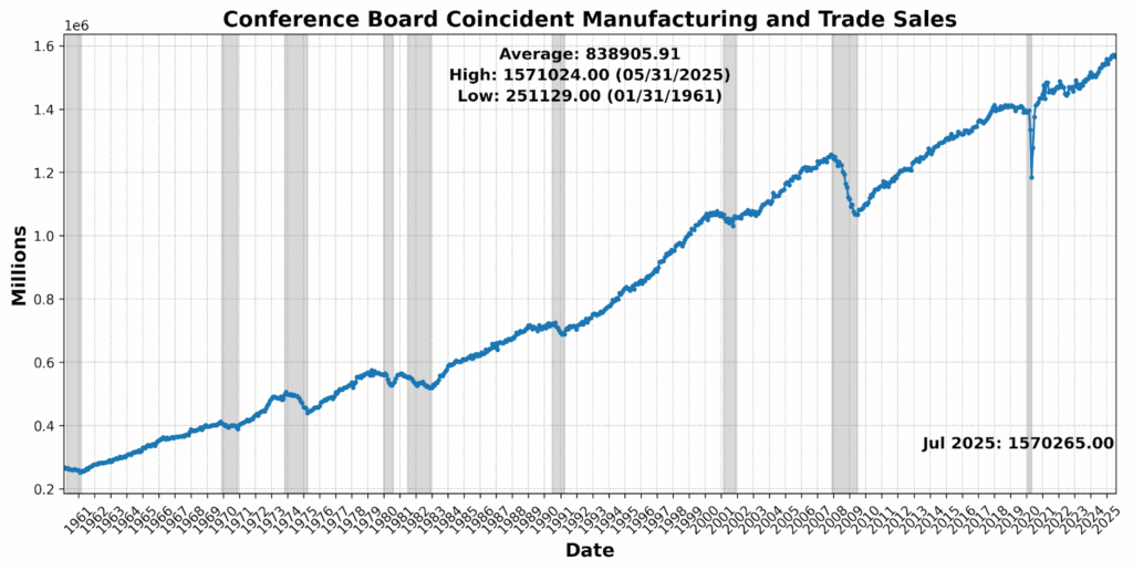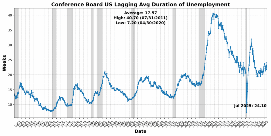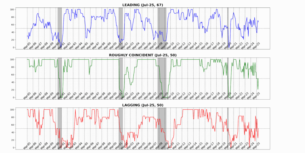 The Roughly Coincident Indicator rose from 21 to 50, marking a pause after June’s sharp contraction. Stability at this level reflects an offsetting mix of modest gains in sales, income, and payrolls against declines in production, participation, and sentiment — leaving the real-time picture flat but fragile.