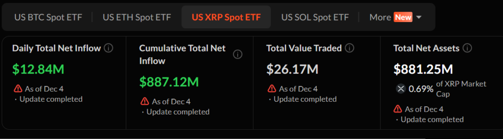 XRP ETFs have attracted over $887 million in total net inflows since launching on November 13.