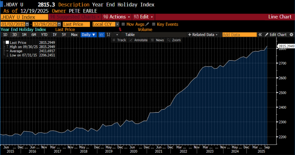 Our proprietary HDAY Index captures price movements across a broad basket of holiday-relevant goods and services, including apparel, toys, books, software, jewelry, pet and personal care items, gift-wrapping materials, postage and shipping, alcohol, confectionery, houseplants, and movie tickets. The table below presents both the average annual rate of change and the cumulative price increase for the five years preceding the pandemic and the five years that followed. These results are shown alongside changes in the Employment Cost Index as well as key holiday travel expenses over the same periods, including airfare and gasoline.