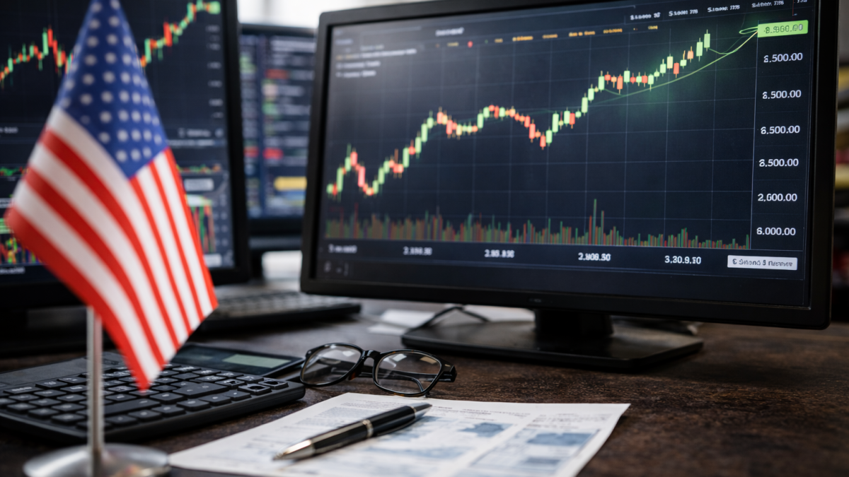 Computer monitors displaying stock market charts on a trading desk with a small U.S. flag, calculator, glasses and financial documents.
