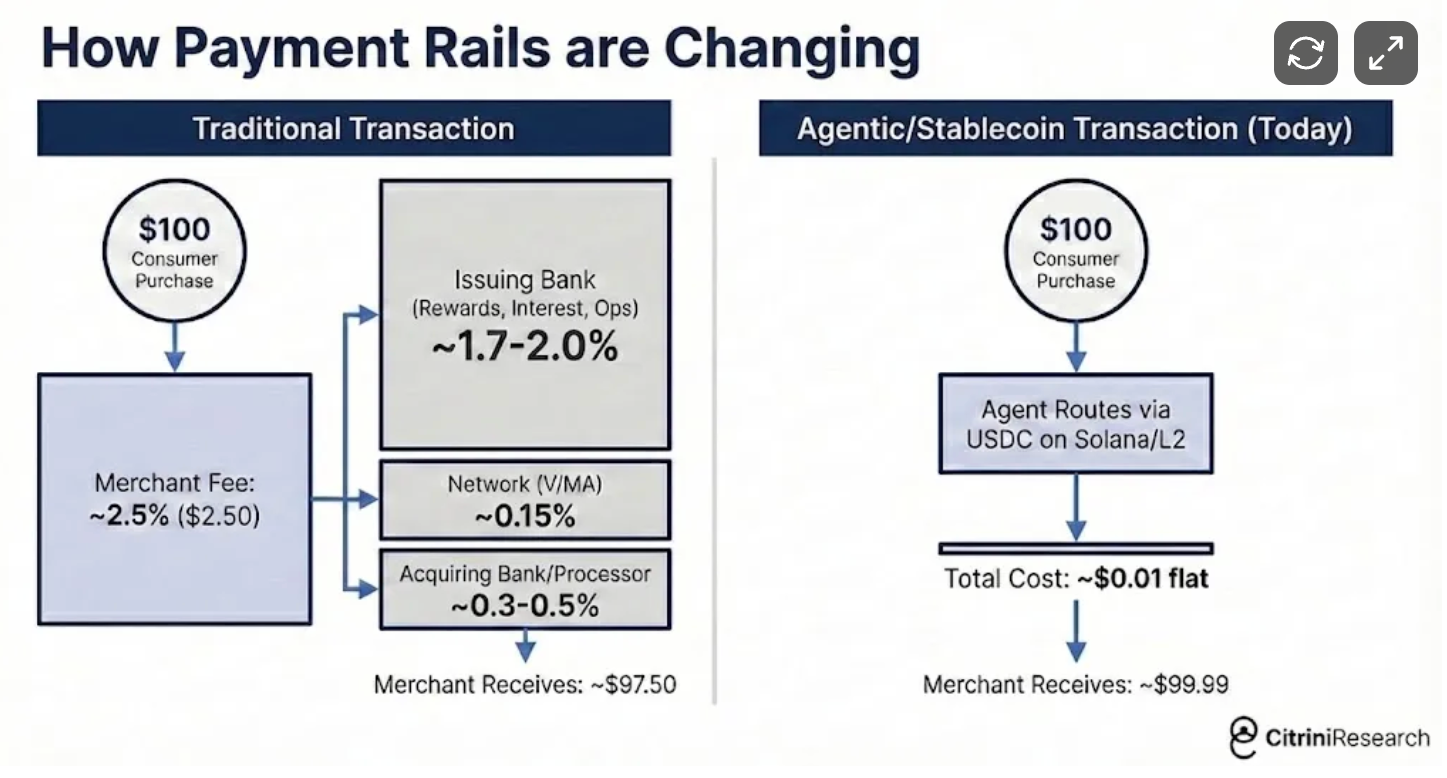 The 2% to 3% card interchange fees that fund the banking sector and rewards programs are being routed around by agents using stablecoins on Solana or Ethereum L2s.