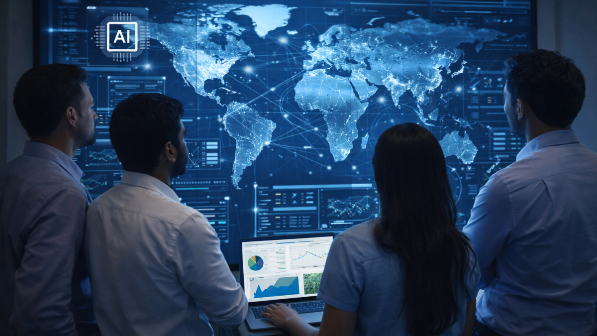 Professionals reviewing a large digital world map and analytics dashboard showing AI network connections and data metrics.