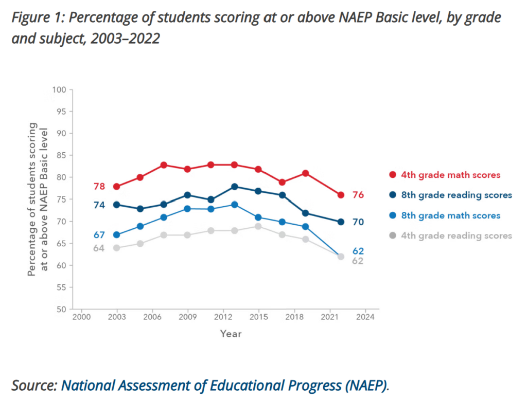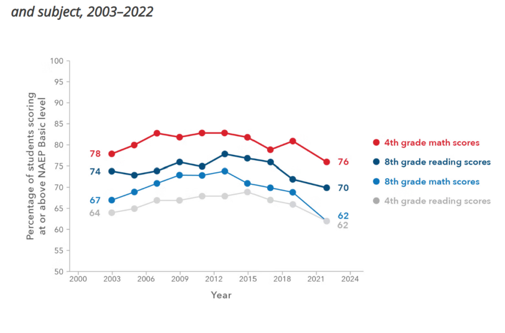 In the broader statistics, elementary scores on standardized tests saw their worst outcomes in 2023, and except for 4th-grade math scores, only 2022 was worse.
