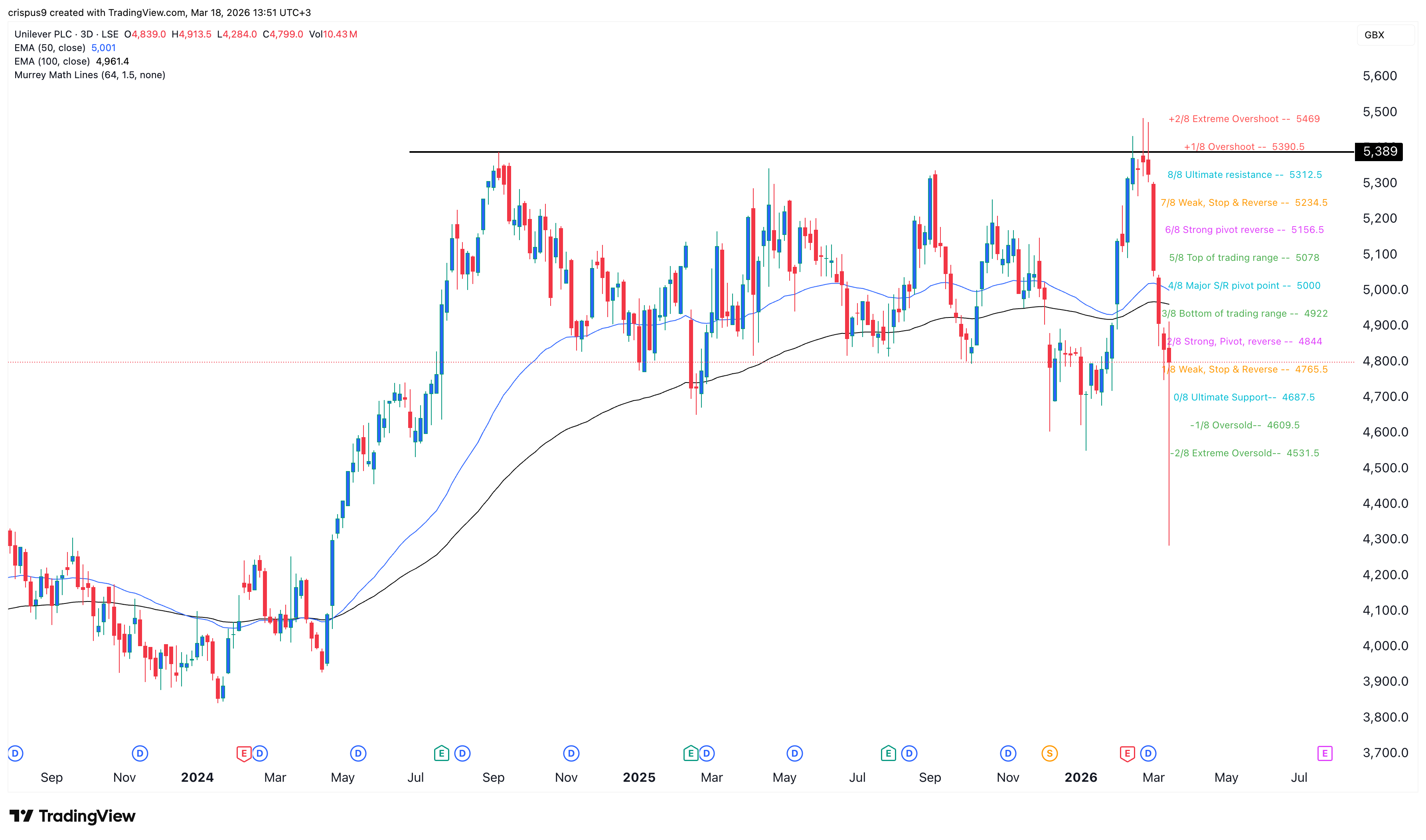 The three-day chart shows that the Unilever stock price has been in a freefall in the past few weeks. It has dropped from 5,480p to the current 4,800p.