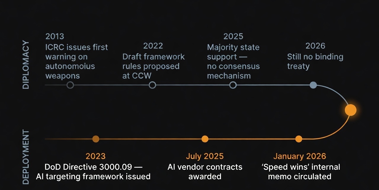 That timeline matters because the military and diplomatic tracks are moving in opposite directions. In Geneva, states are still debating baseline rules.