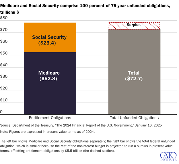 The long-term picture is even worse. According to the government’s Financial Report, more than 100 percent of long-term unfunded obligations stem from just two programs: Medicare and Social Security (their combined shortfalls reflect the difference between their dedicated taxes and projected spending, which exceed the total because the rest of the budget shows a small projected surplus over the same period).