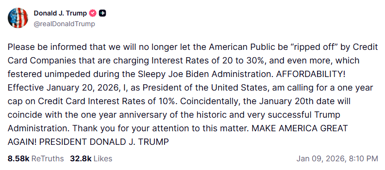 On January 10 of this year, President Trump posted a call for credit card interest rate caps of 10 percent, effective January 20. His announcement was not followed by an executive order, so the cap hasn’t been implemented (it would have been interesting to see what presidential authority he claimed, but that’s a different story).
