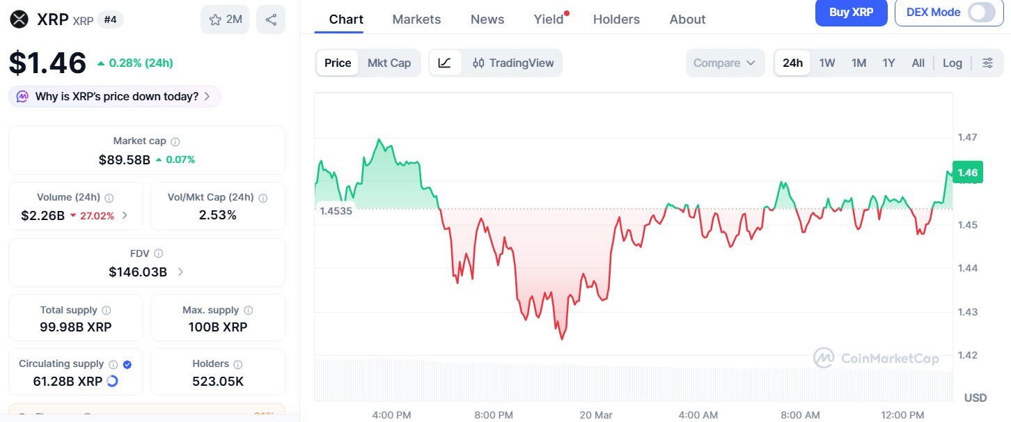 XRP is now trading slightly higher than $1.46, up by 0.29% in the last 24 hours.