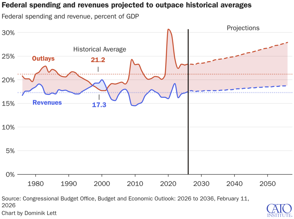 Because the urgency to rein in the growth of US debt is no longer abstract. The United States has now been downgraded by all three major credit rating agencies. Interest costs are rising rapidly and already rival spending on national defense. Looking ahead, the federal government’s largest obligations — Social Security, Medicare, Medicaid, and interest on the debt — are projected to consume all federal revenues within little more than a decade. At that point, every other government function — from national defense to infrastructure to basic operations — would have to be financed with borrowed money.