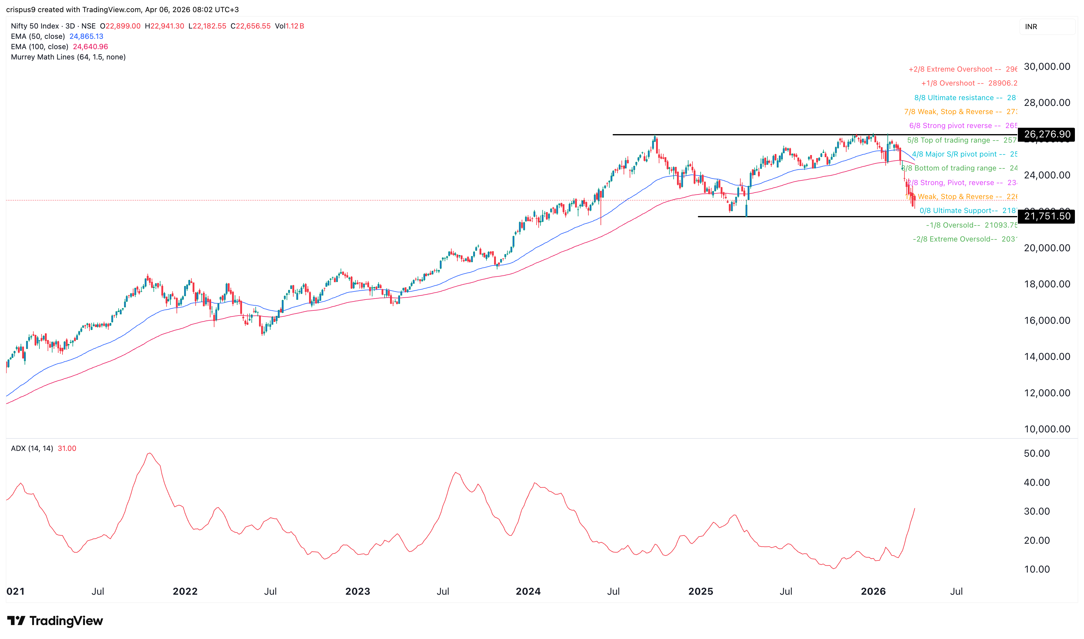 The Nifty 50 Index remained in a correction on Monday as the risks to the Indian economy continued. It dropped to INR 22,678, down by nearly 14% from its highest point this year, and technicals suggest that it has more downside in the near term as the Iran war and bank crisis continue.