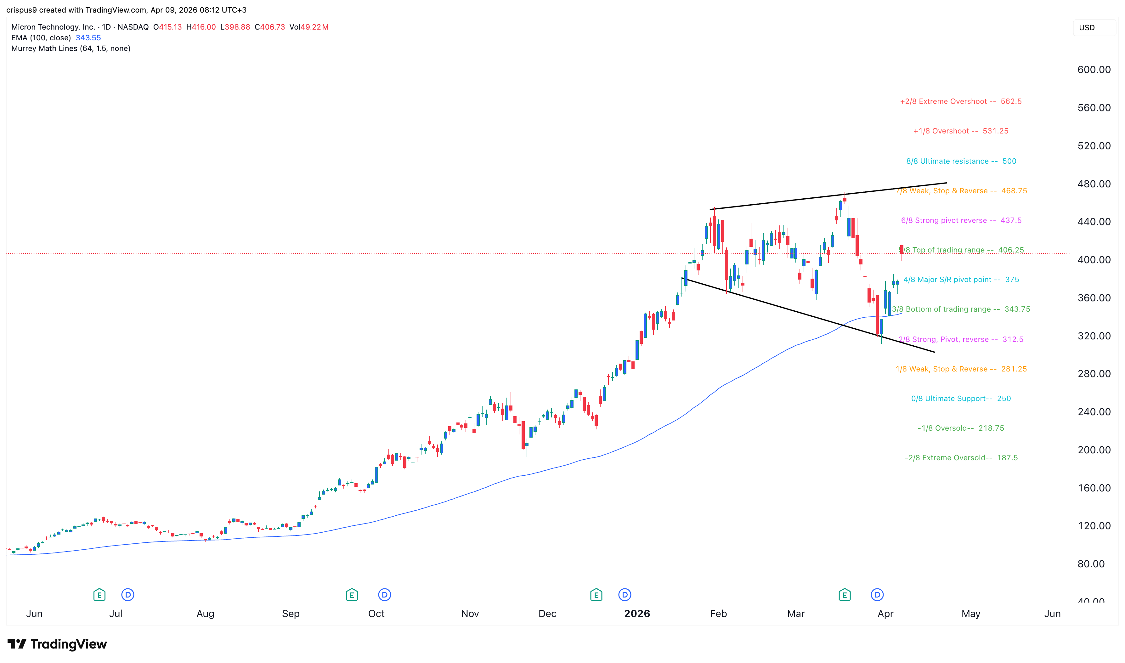 The daily timeframe chart shows that the MU stock has rebounded in the past few days, moving from a low of $314 on March 31 to the current $406.