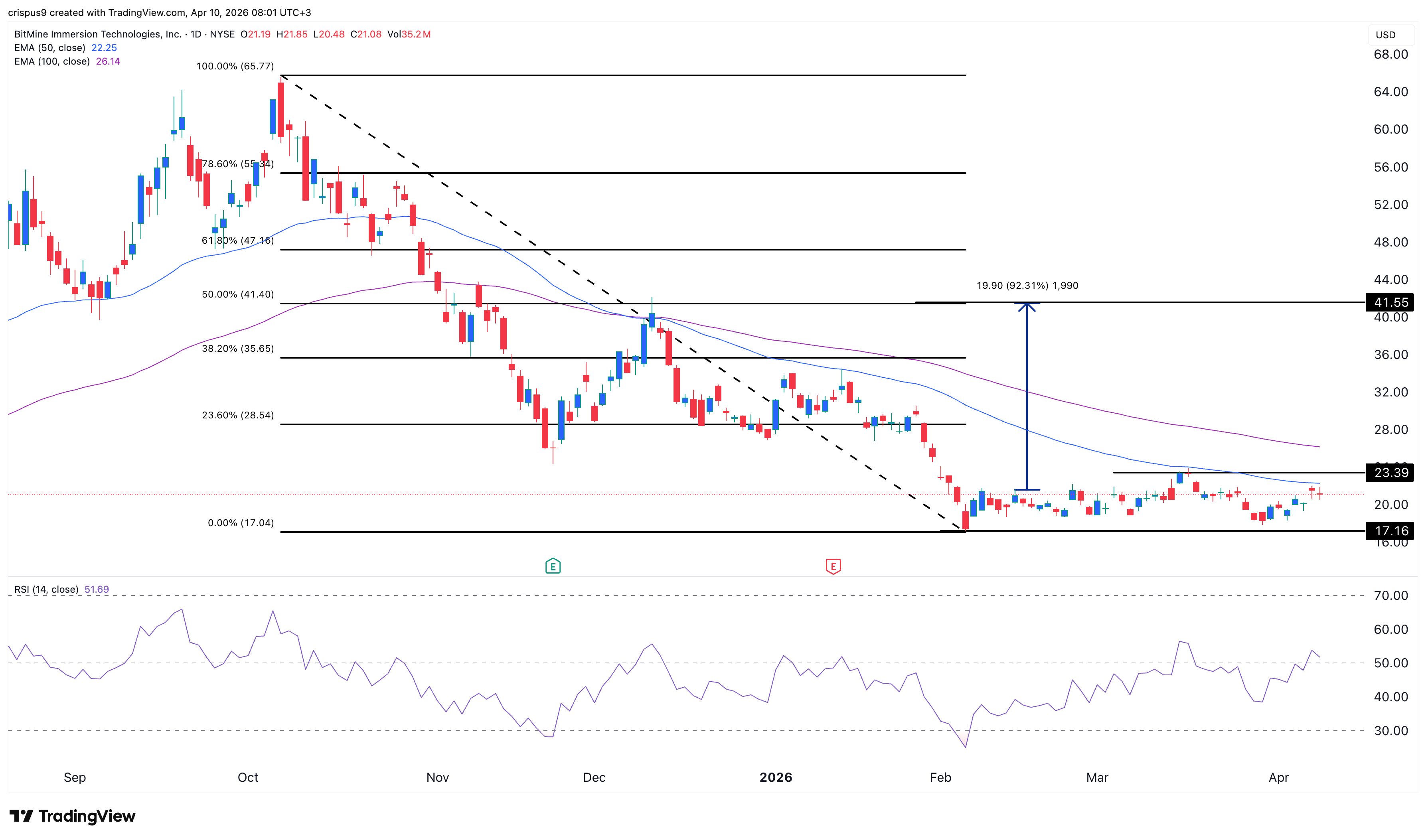 Technicals also suggest that the BMNR stock price may rebound in the near term. It has formed a double-bottom pattern at $17 and a neckline at $23.40. This pattern is often a good sign of a reversal.