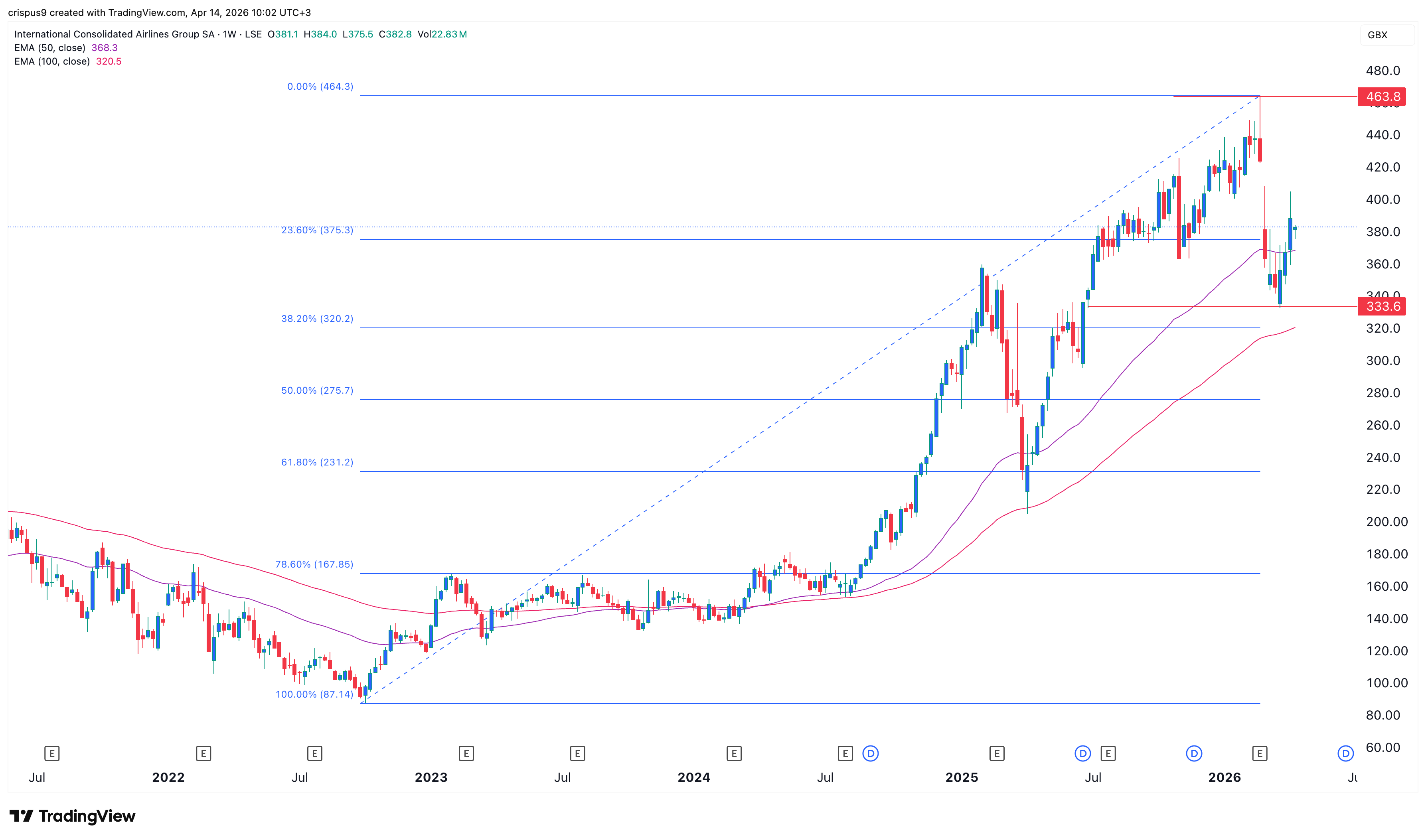 The weekly chart shows that the IAG stock price has rebounded in the past few weeks. It soared from a low of €333 after the Iran war started and moved to the current €383.