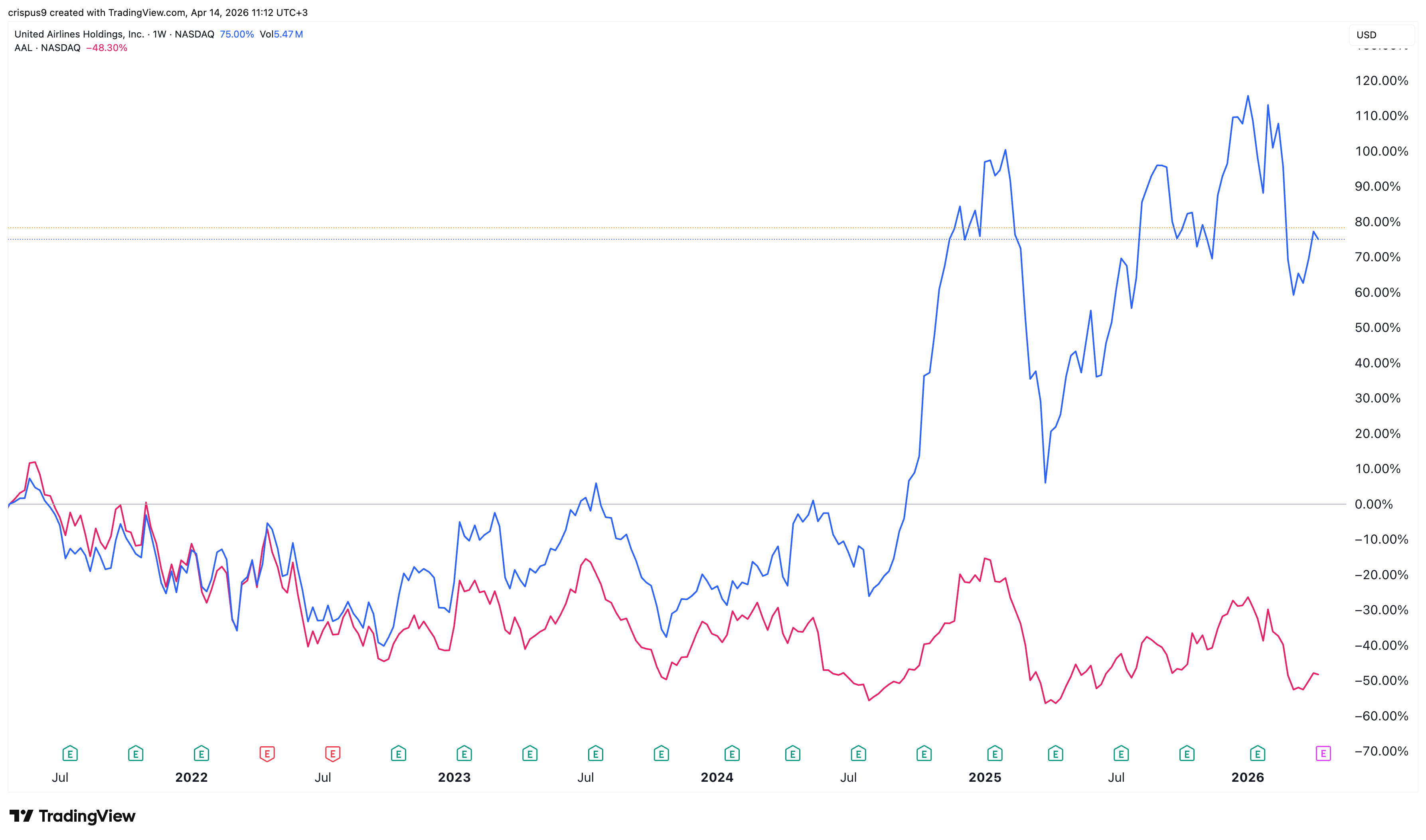 The main catalyst for the AAL and UAL stocks is reports that United Airlines wants to merge with American, a deal that would create the biggest airline in the US. United has a market capitalization of over $30 billion, while American is valued at $7.2 billion.