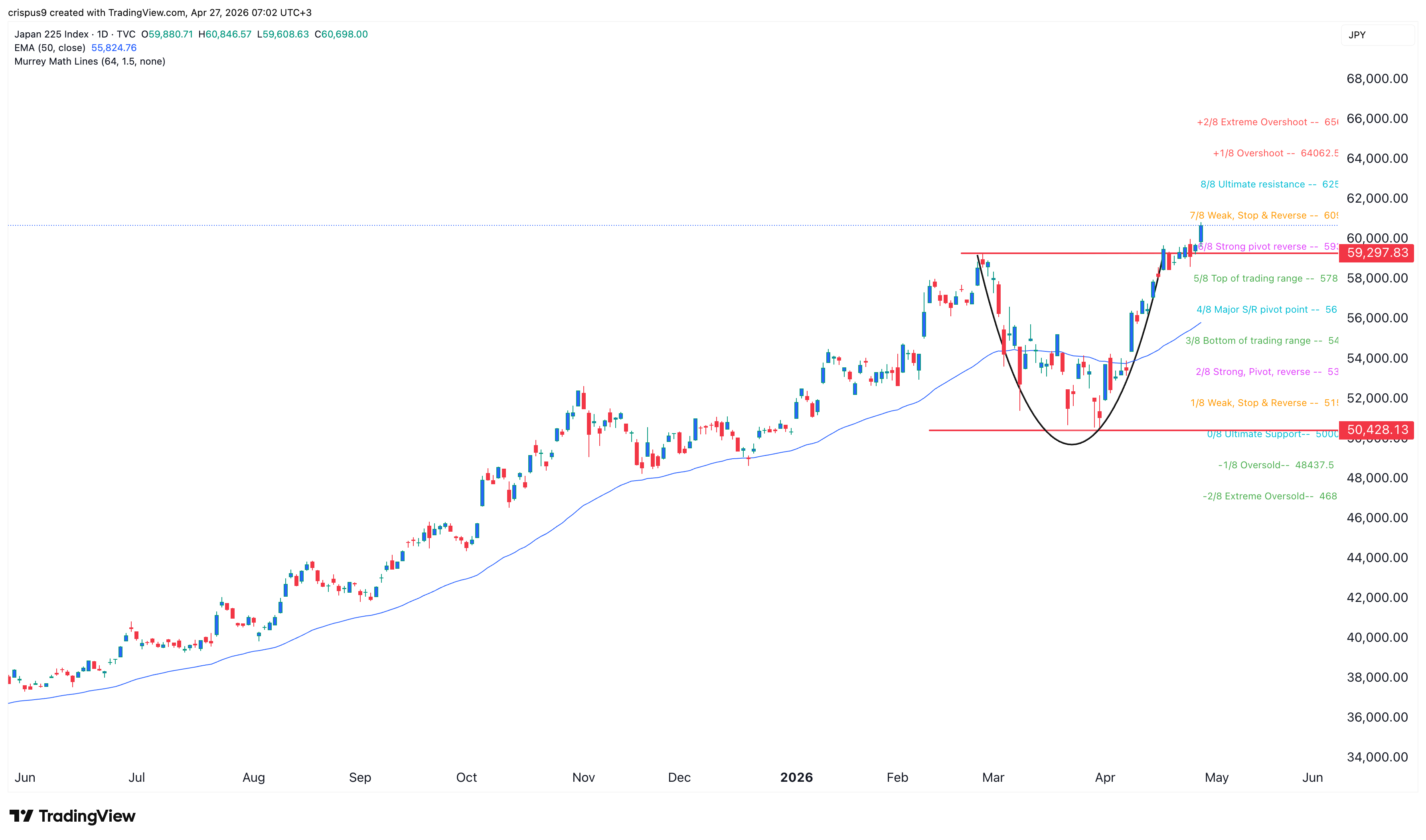 The index remains above all moving averages and the strong pivot reverse of the Murrey Math Lines tool. Therefore, the next key resistance level to watch will be at the ultimate resistance at ¥62,500.